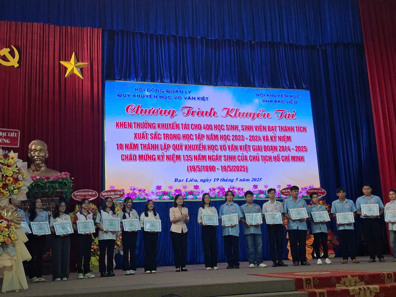 Thực hiện Thông báo số 874/TB-HKH ngày 08 tháng 5 năm 2025 của Hội Khuyến học tỉnh Bạc Liêu về việc xét chọn học sinh, học viên, sinh viên khen thưởng khuyến tài năm học 2023 - 2024, chiều ngày 19 tháng 5 năm 2025, tại Trung tâm văn hóa tỉnh Bạc Liêu, Hội Khuyến học đã tổ chức Chương trình khen thưởng khuyến tài cho học sinh, học viên, sinh viên có địa chỉ thường trú tại tỉnh Bạc Liêu đang theo học tại các Trường, Trung tâm Giáo dục thường xuyên - Dạy nghề cấp huyện, Trung tâm Giáo dục thường xuyên - Hướng nghiệp tỉnh, trường Đại học, Cao đẳng trên địa bàn tỉnh Bạc Liêu và sinh viên có địa chỉ thường trú tại tỉnh Bạc Liêu đang theo học tại các trường Đại học trên địa bàn thành phố Cần Thơ.