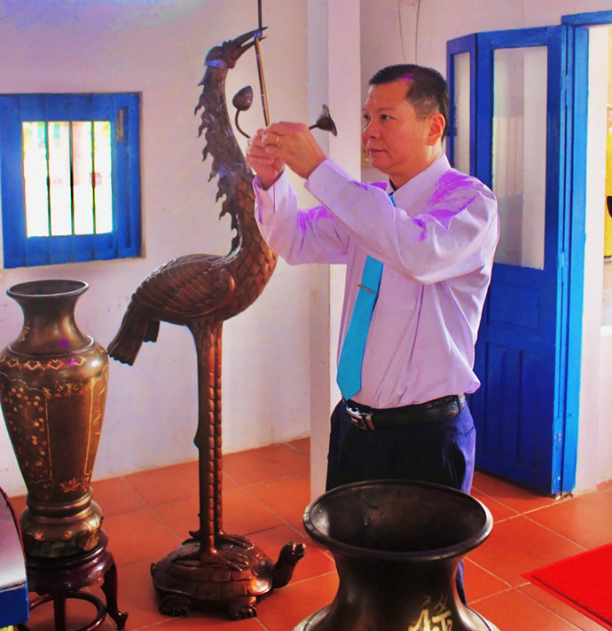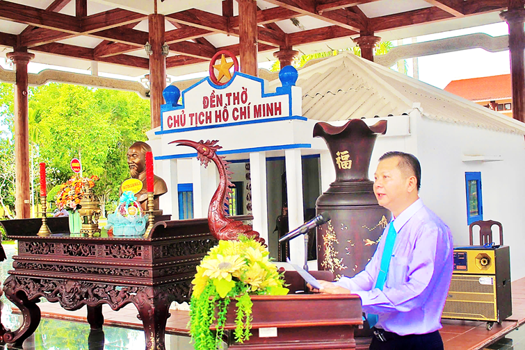 Đồng chí Nguyễn Thanh Sang - Bí thư đảng ủy, Hiệu trưởng nhà trường báo công kính dâng Bác thành tích của đảng bộ trường