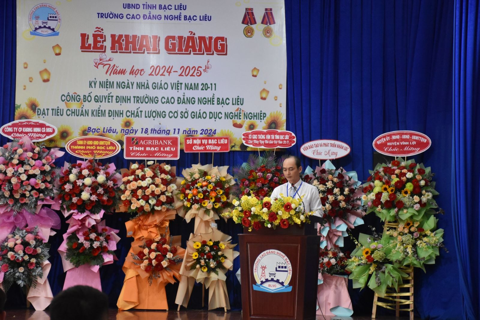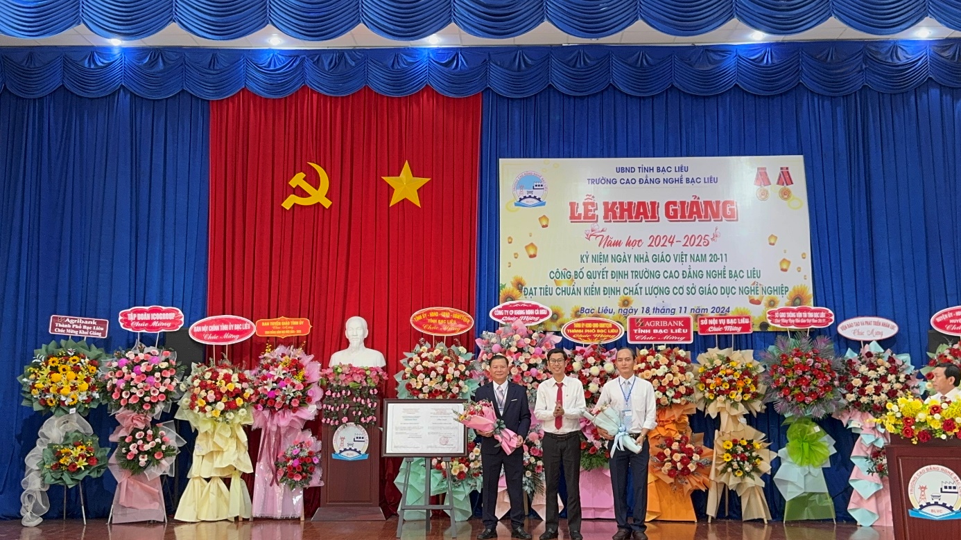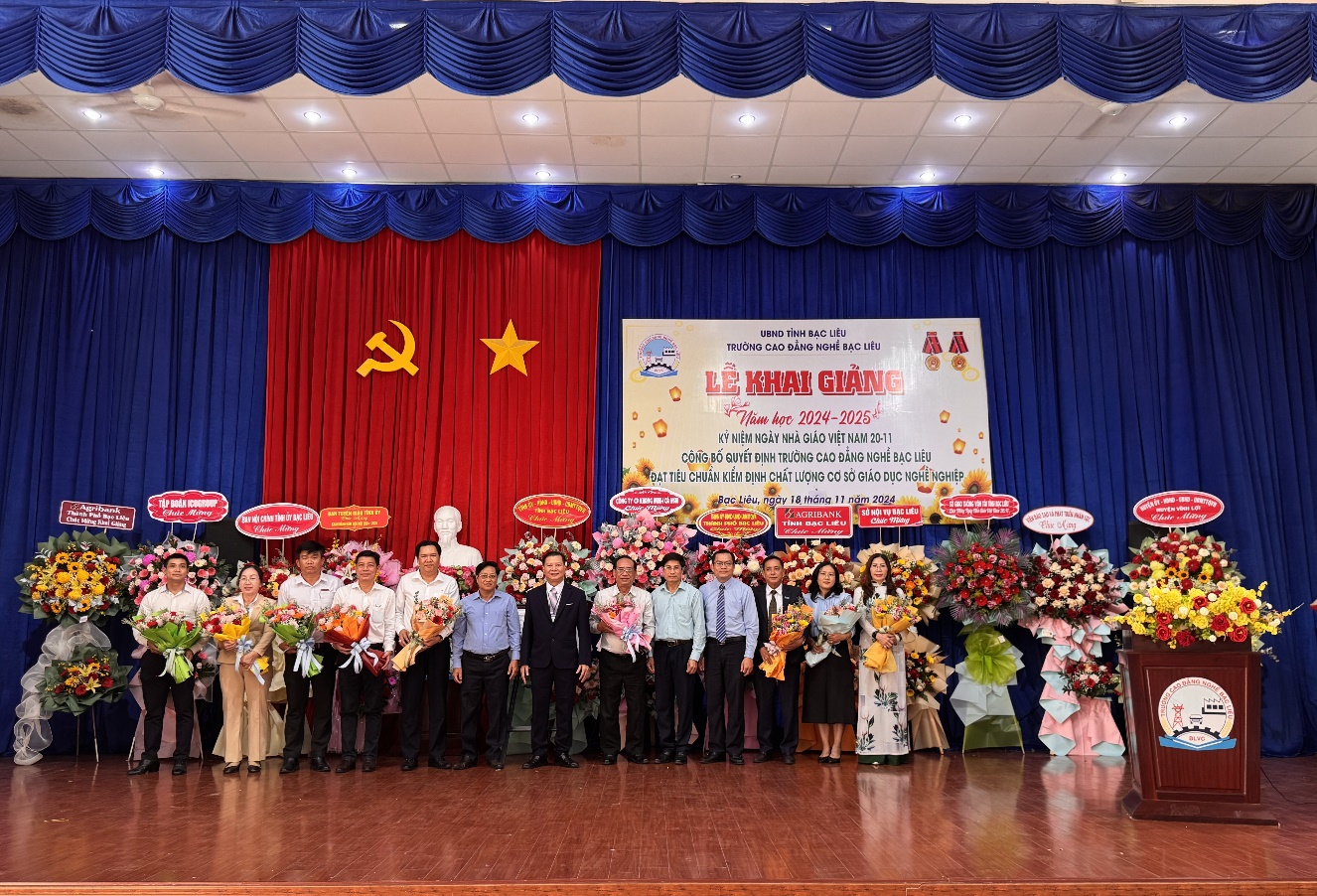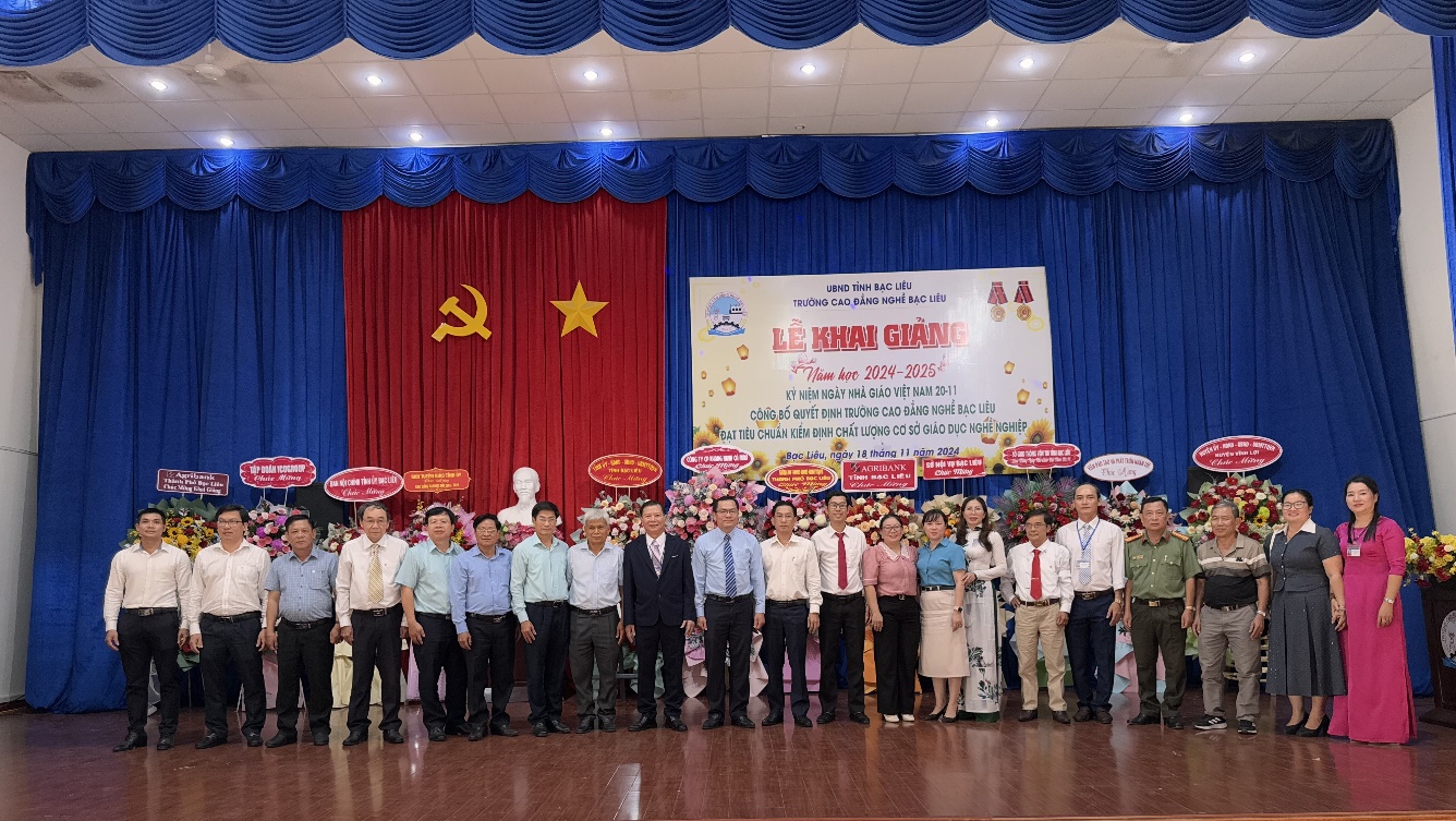 Chiều 18/11, Trường Cao đẳng Nghề Bạc Liêu long trọng tổ chức khai giảng năm học 2024-2025; kỷ niệm 42 năm Ngày Nhà giáo Việt Nam (20/11/1982-20/11/2024); công bố quyết định và trao chứng nhận đạt tiêu chuẩn kiểm định chất lượng cơ sở giáo dục nghề nghiệp cho Trường Cao đẳng Nghề Bạc Liêu. Đến dự buổi lễ có các đồng chí Tạ Trung Dũng-UV BTV Tỉnh ủy, Trưởng Ban Tuyên giáo Tỉnh ủy; Bùi Tấn Bảy-Tỉnh ủy viên, Phó Chủ tịch Thường trực HĐND tỉnh; Ngô Vũ Thăng-Tỉnh ủy viên, Phó Chủ tịch UBND tỉnh...; đại diện lãnh đạo các sở, ban, ngành trong tỉnh; các trường đại học, cao đẳng và các doanh nghiệp trong và ngoài tỉnh cùng tập thể viên chức và 300 học sinh sinh viên đại diện cho hơn 1400 học sinh sinh viên của nhà trường.