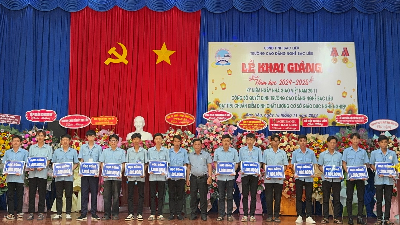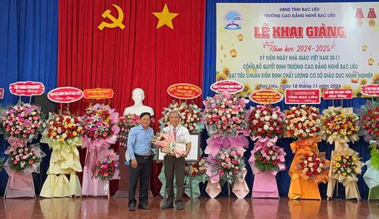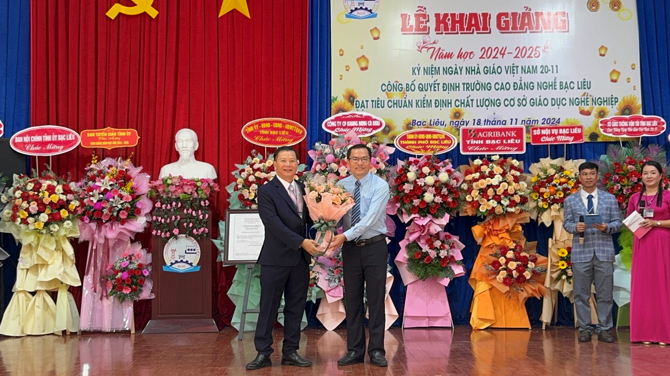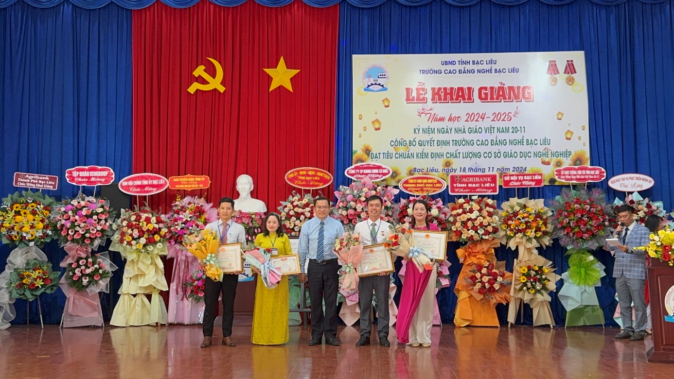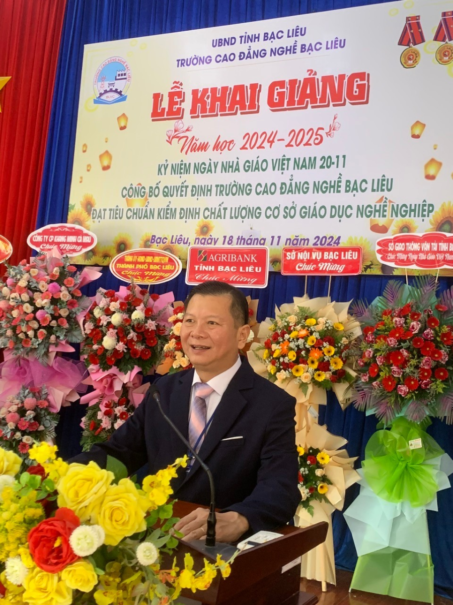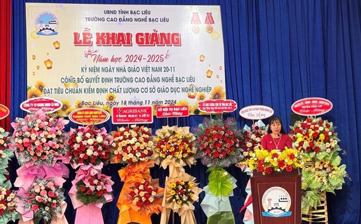 Chiều 18/11, Trường Cao đẳng Nghề Bạc Liêu long trọng tổ chức khai giảng năm học 2024-2025; kỷ niệm 42 năm Ngày Nhà giáo Việt Nam (20/11/1982-20/11/2024); công bố quyết định và trao chứng nhận đạt tiêu chuẩn kiểm định chất lượng cơ sở giáo dục nghề nghiệp cho Trường Cao đẳng Nghề Bạc Liêu. Đến dự buổi lễ có các đồng chí Tạ Trung Dũng-UV BTV Tỉnh ủy, Trưởng Ban Tuyên giáo Tỉnh ủy; Bùi Tấn Bảy-Tỉnh ủy viên, Phó Chủ tịch Thường trực HĐND tỉnh; Ngô Vũ Thăng-Tỉnh ủy viên, Phó Chủ tịch UBND tỉnh...; đại diện lãnh đạo các sở, ban, ngành trong tỉnh; các trường đại học, cao đẳng và các doanh nghiệp trong và ngoài tỉnh cùng tập thể viên chức và 300 học sinh sinh viên đại diện cho hơn 1400 học sinh sinh viên của nhà trường.