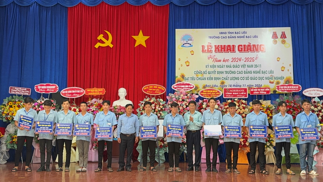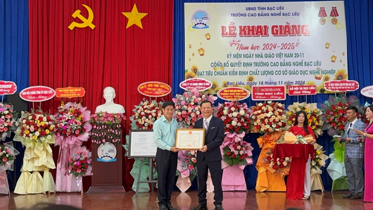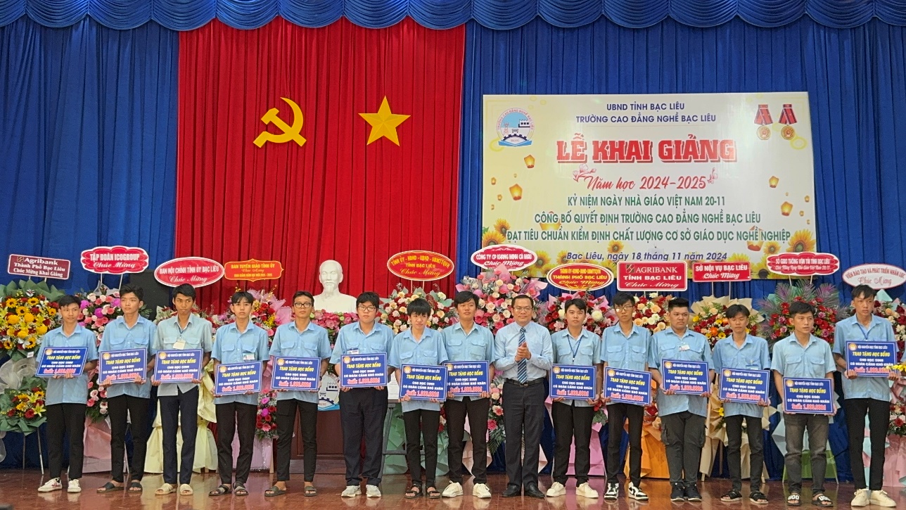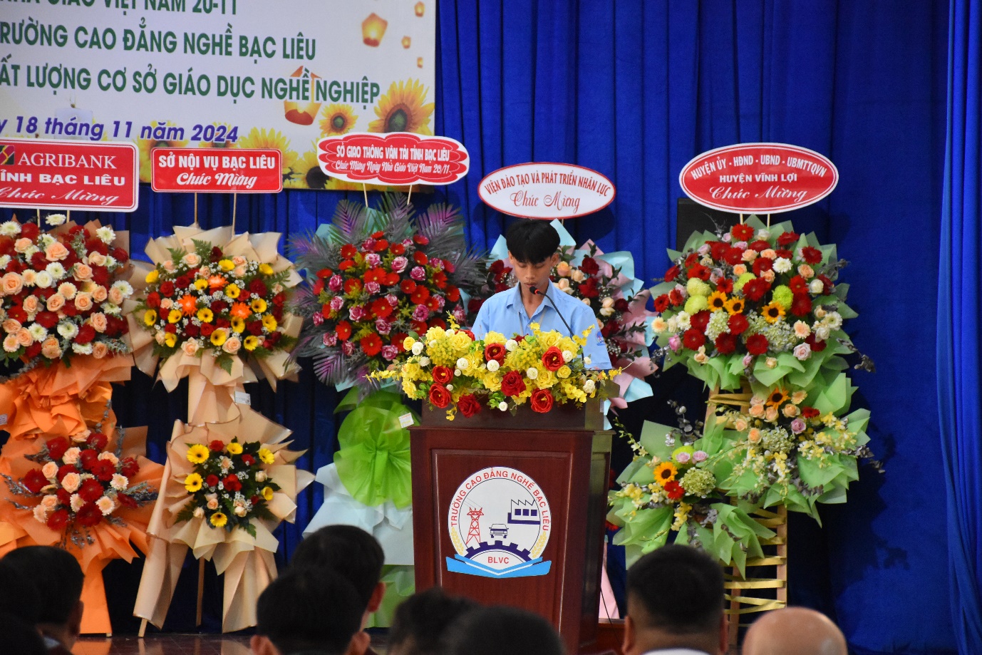 Chiều 18/11, Trường Cao đẳng Nghề Bạc Liêu long trọng tổ chức khai giảng năm học 2024-2025; kỷ niệm 42 năm Ngày Nhà giáo Việt Nam (20/11/1982-20/11/2024); công bố quyết định và trao chứng nhận đạt tiêu chuẩn kiểm định chất lượng cơ sở giáo dục nghề nghiệp cho Trường Cao đẳng Nghề Bạc Liêu. Đến dự buổi lễ có các đồng chí Tạ Trung Dũng-UV BTV Tỉnh ủy, Trưởng Ban Tuyên giáo Tỉnh ủy; Bùi Tấn Bảy-Tỉnh ủy viên, Phó Chủ tịch Thường trực HĐND tỉnh; Ngô Vũ Thăng-Tỉnh ủy viên, Phó Chủ tịch UBND tỉnh...; đại diện lãnh đạo các sở, ban, ngành trong tỉnh; các trường đại học, cao đẳng và các doanh nghiệp trong và ngoài tỉnh cùng tập thể viên chức và 300 học sinh sinh viên đại diện cho hơn 1400 học sinh sinh viên của nhà trường.