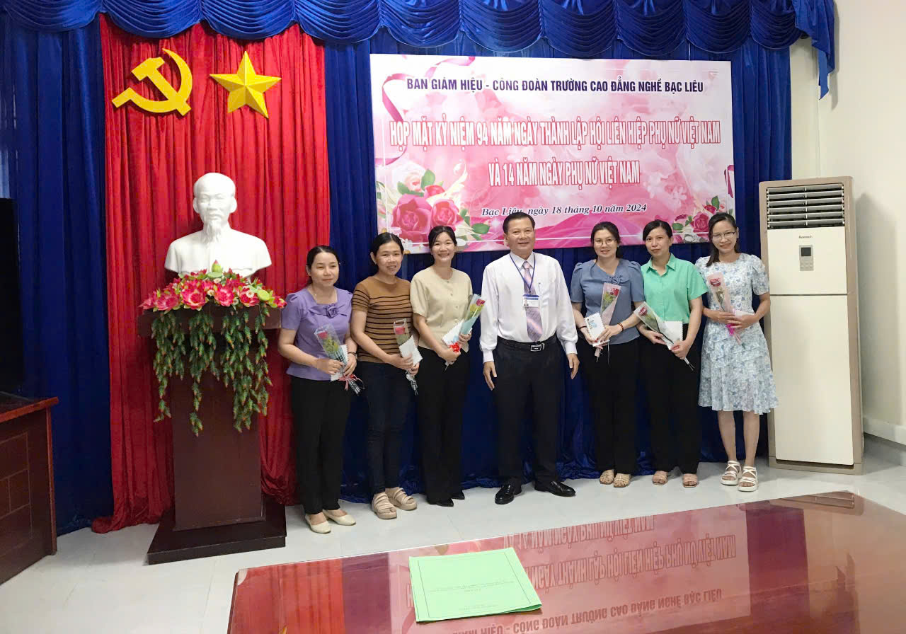Nhân kỷ niệm 94 năm ngày thành lập Hội liên hiệp phụ nữ Việt Nam (20/10/1930 - 20/10/2024) và 14 năm ngày Phụ nữ Việt Nam (20/10/2010 -20/10/2024), chiều ngày 18/10/2024 tại phòng họp Trường Cao đẳng nghề Bạc Liêu đã tổ chức buổi họp mặt giữa Hiệu trưởng, BCH Công đoàn trường và toàn thể viên chức nữ đang làm việc tại Trường Cao đẳng nghề Bạc Liêu nhằm ôn lại truyền thống của ngày lễ đặc biệt này và tôn vinh nữ viên chức trong toàn đơn vị.