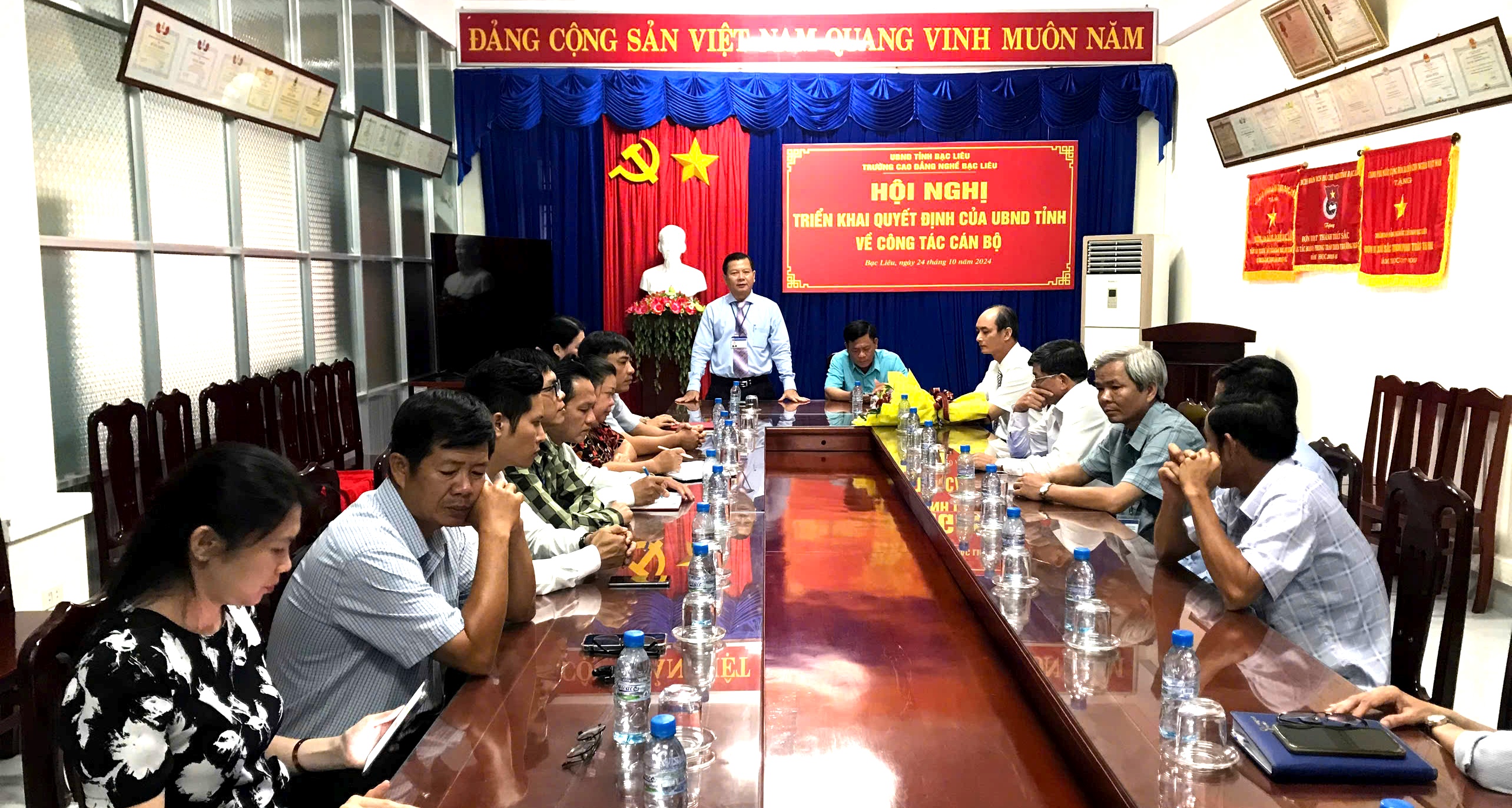 Chiều ngày 24/10/2024, Trường Cao đẳng Nghề Bạc Liêu đã tổ chức hội nghị triển khai quyết định về công tác cán bộ. Tham dự hội nghị có Tiến sĩ Nguyễn Thanh Sang - Bí thư Đảng ủy, Hiệu Trưởng Nhà trường; đồng chí Nguyễn Minh Thất, Phó Giám đốc Sở Nội vụ, Chủ tịch Hội đồng Trường Cao đẳng Nghề Bạc Liêu, đồng chí Ký Trọng Nghiệm, Chuyên viên chính, Phòng Công chức - Viên chức, Sở Nội vụ tỉnh Bạc Liêu, cùng quý thầy cô là lãnh đạo các Phòng, Khoa, Trung tâm.